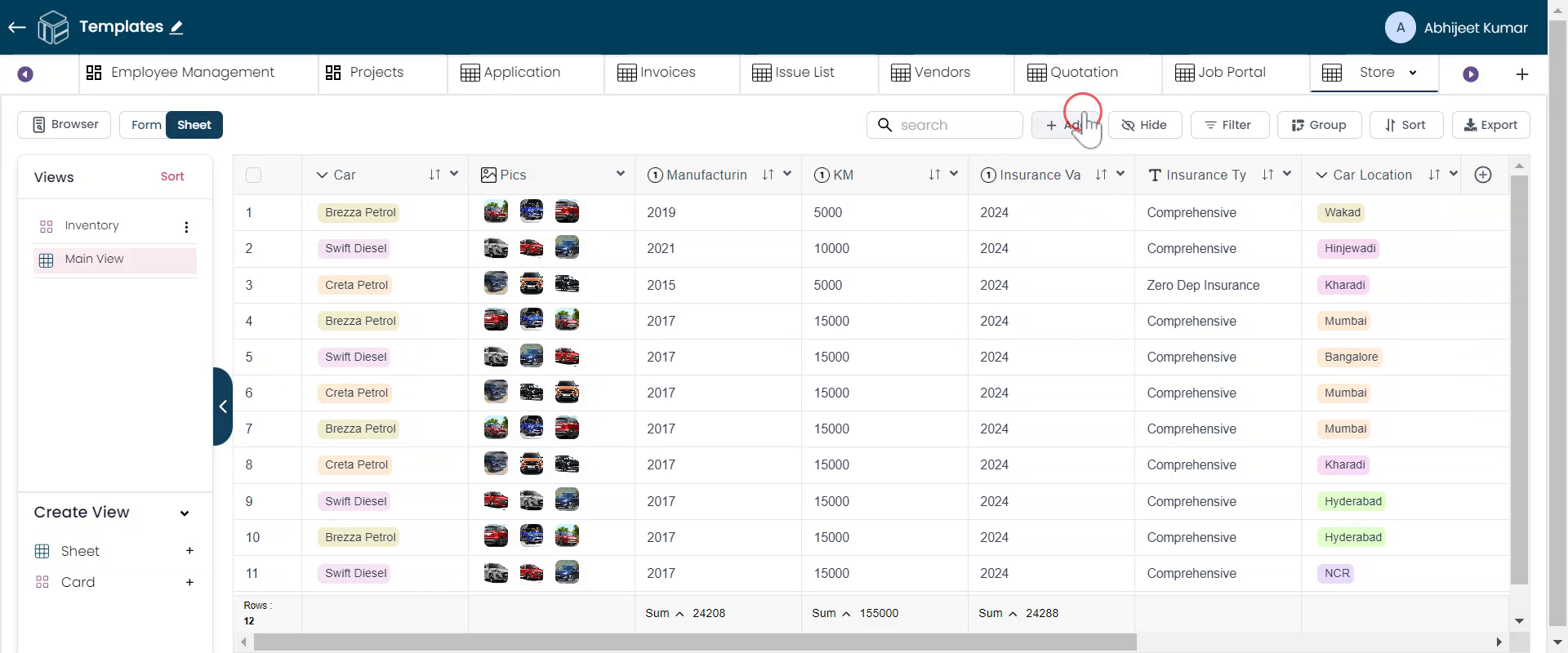 To add a record to our Car Store table, click the "Add" button. This will open up a form.
